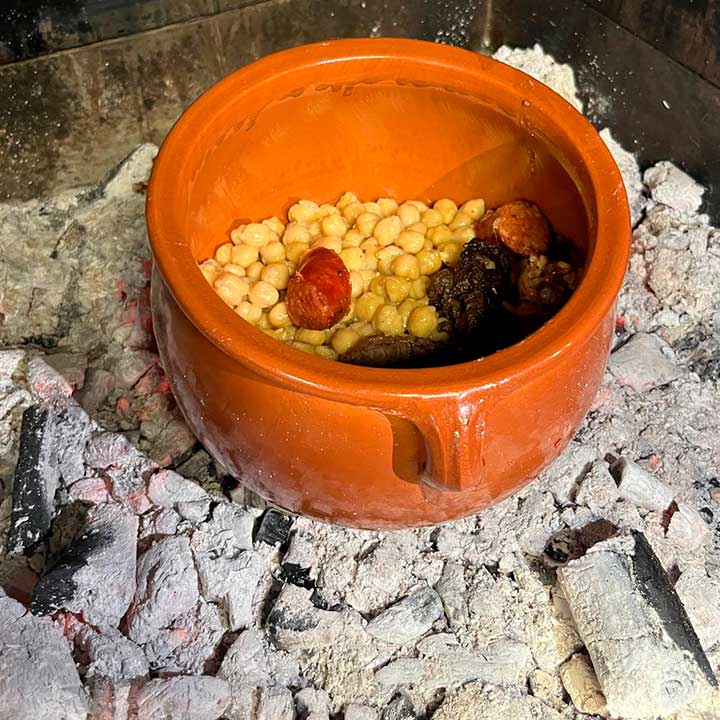 Cocido durante horas sobre el carbon en nuestra mejor parrilla con huesos, verduras y garbanzos de primera.